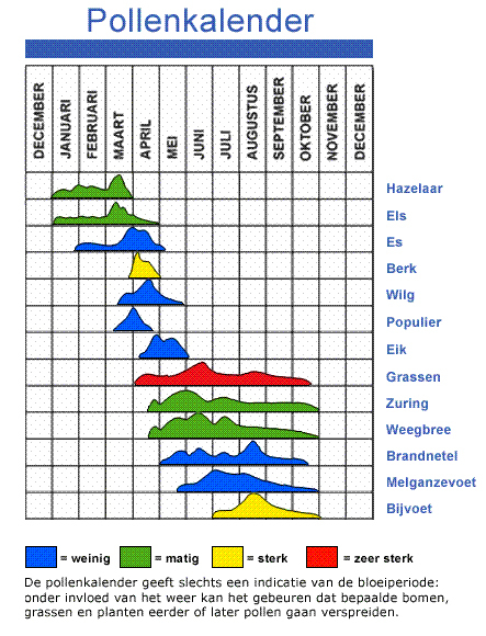 Het gevolg is dat hooikoorts tegenwoordig bijna het hele jaar onder ons is. Er zijn nog maar een paar maanden veilig. Zoals deze Pollenkalender laat zien.