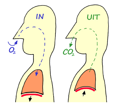 Kijk je naar ademen, dan zie je dat de zuurstof (O2) die je inademt door de cellen gebruikt worden om energie te maken. Daarbij wordt ook koolzuurgas (CO2) geproduceerd, dat je uitademt.